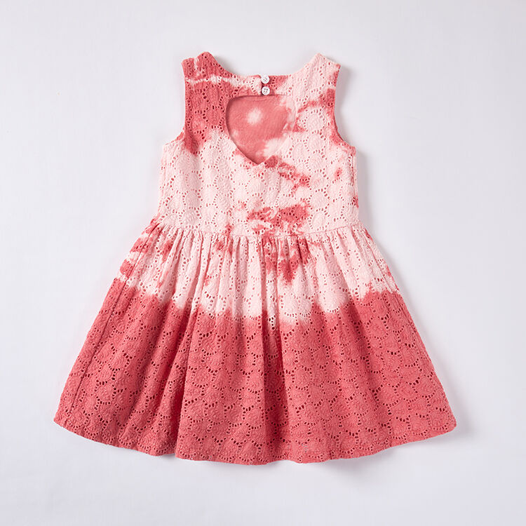 The combination of the classic, sleeveless A-line silhouette with the modern, bold tie-dye pattern and traditional eyelet fabric creates a truly unique piece.