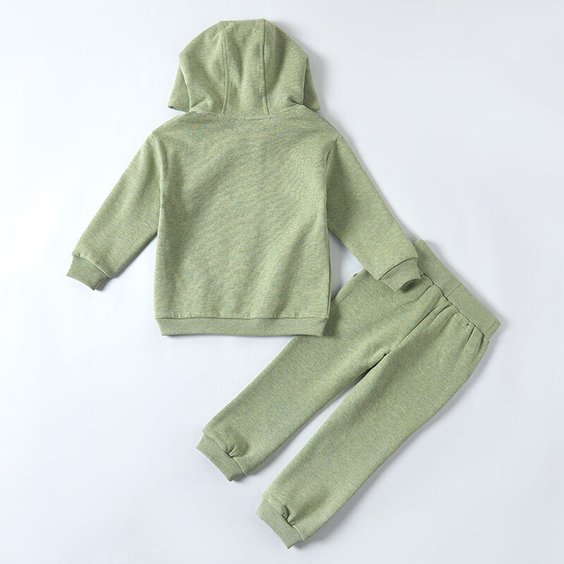 Introducing a premium children's tracksuit designed for the modern, eco-conscious market. This two-piece set, featuring a pullover hoodie and matching joggers, combines playful design with an unwavering commitment to sustainability and safety. The entire garment is colored using 100% natural plant-based dyes, resulting in a soft, heathered green that is free from harmful chemicals. The engaging 3D-effect dinosaur graphic adds a unique, tactile element that elevates the design beyond standard screen printing. This tracksuit is an ideal model for brands looking to offer distinctive, high-value, and responsibly-made apparel to their discerning customers.