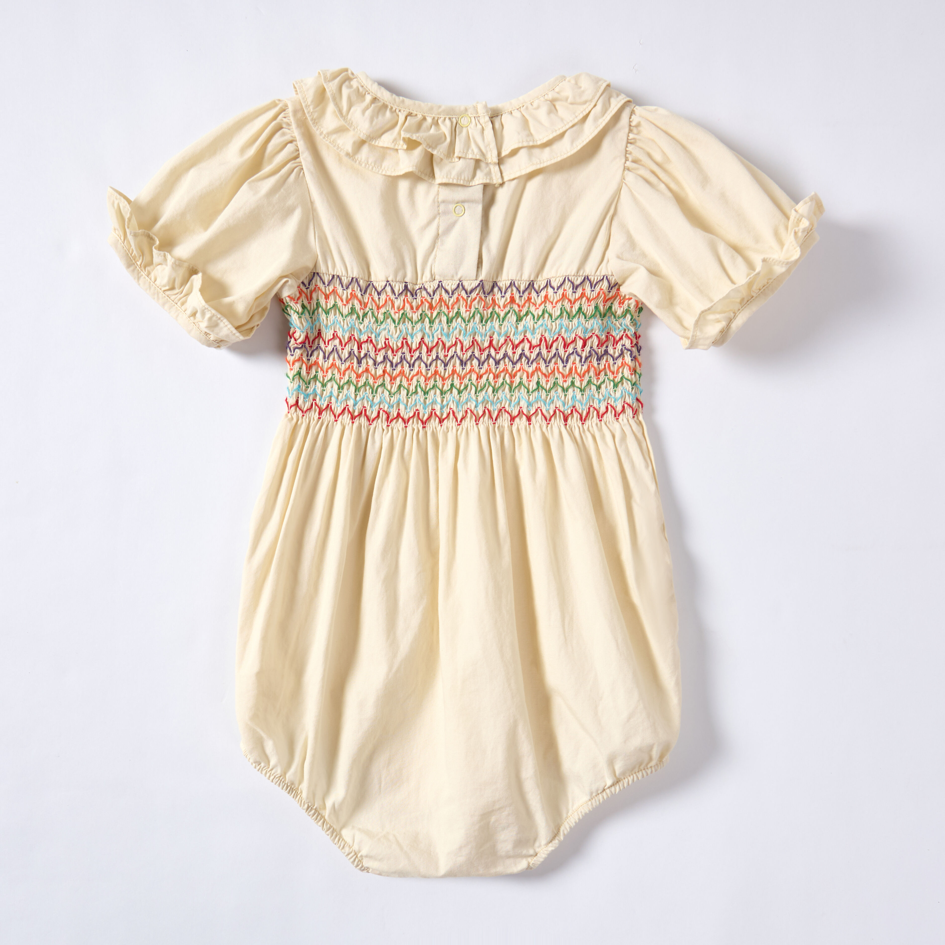 Body in tinta giallo chiaro con maniche corte ricamati, tinti con legno di sappanero, robbia e scorza di melagrano