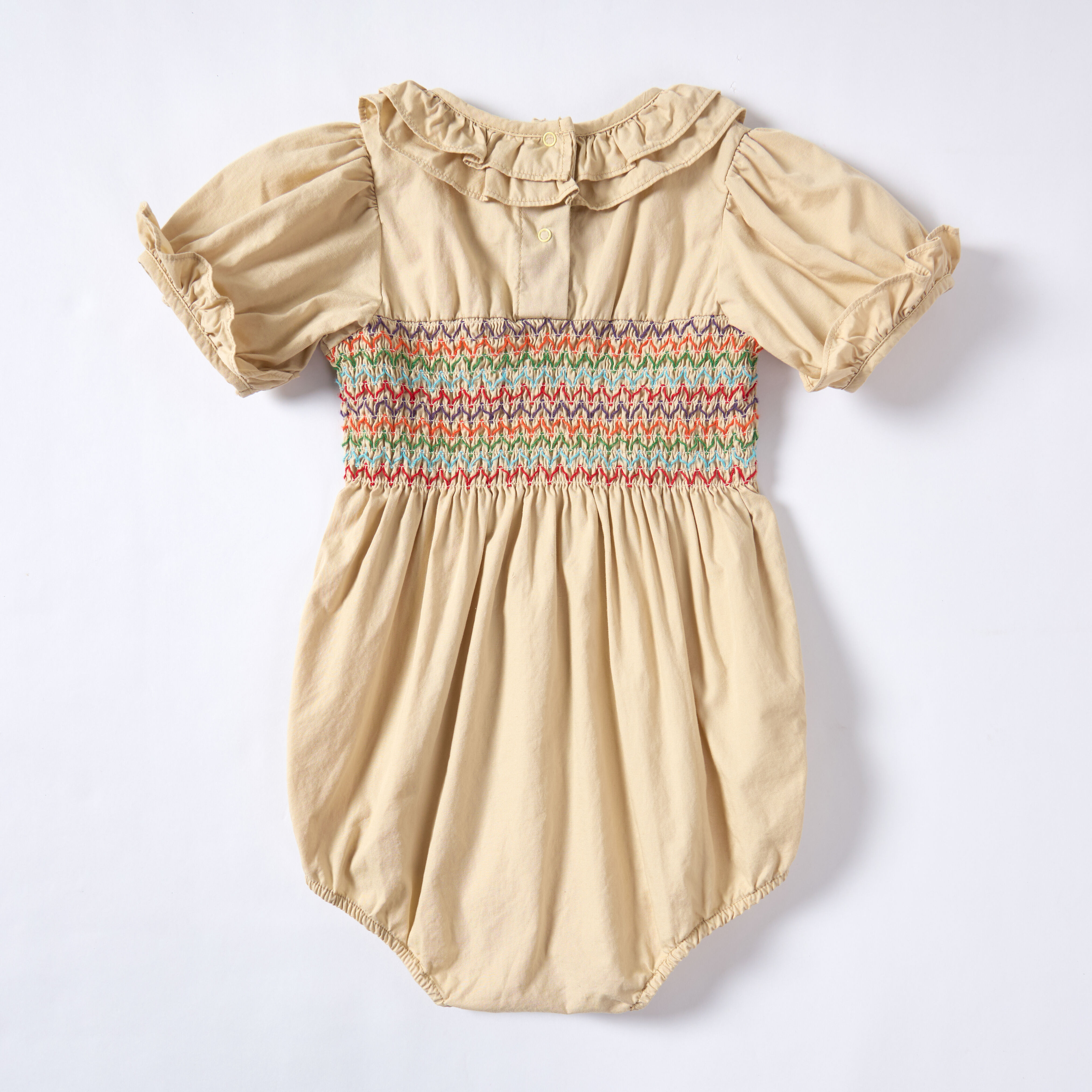 Khaki Sappanwood Pomegranate Peel Dyed Short-Sleeved Embroidered Smock Baby Rompers