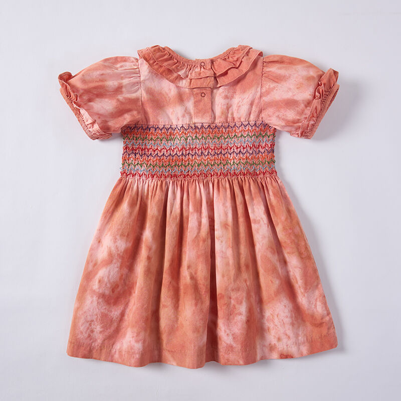 Tie-dye Orange-Pink Short-Sleeved Embroidered Smock Dress Dyed with Sappanwood Madder Pomegranate Peel
